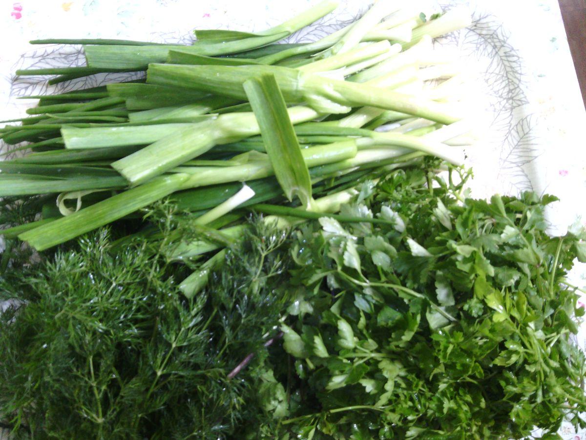 - greens: 300 g parsley, 200 g cilantro, 300 g dill, 3 bunches of green onions, 3-4 stalks of young green garlic, 10-12 bunches of tarragon;