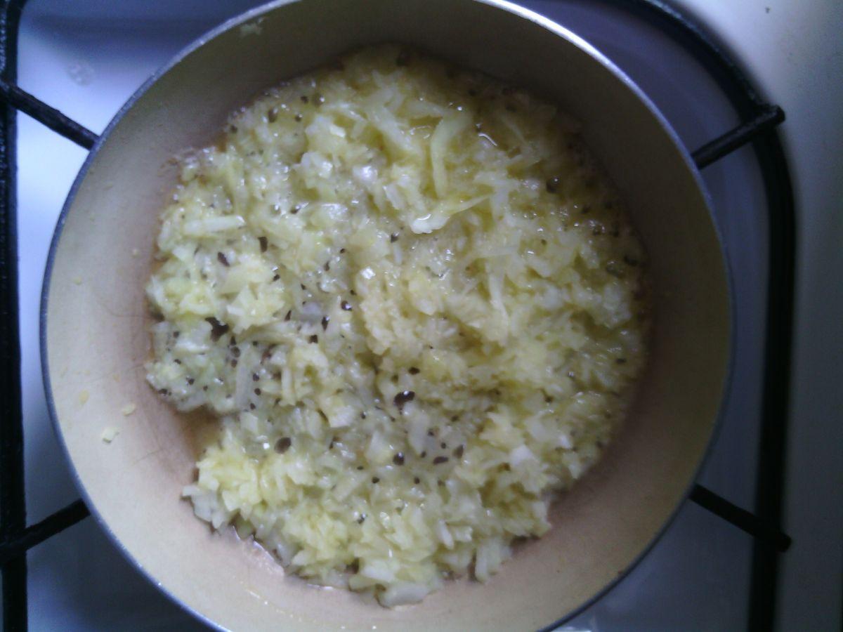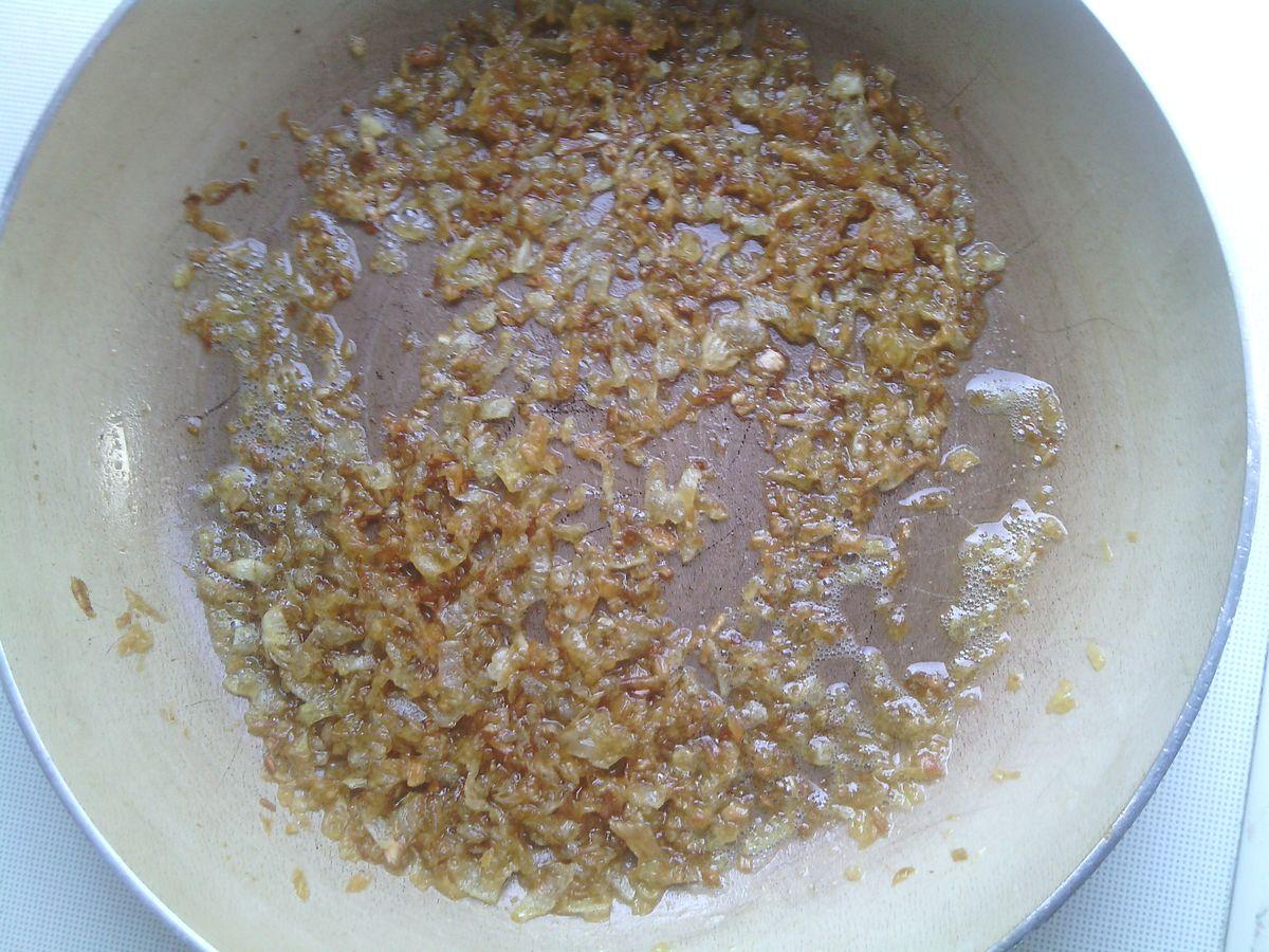 While the chicken is being cooked, finely chop the onion and fry with the addition of butter on low heat until golden brown.