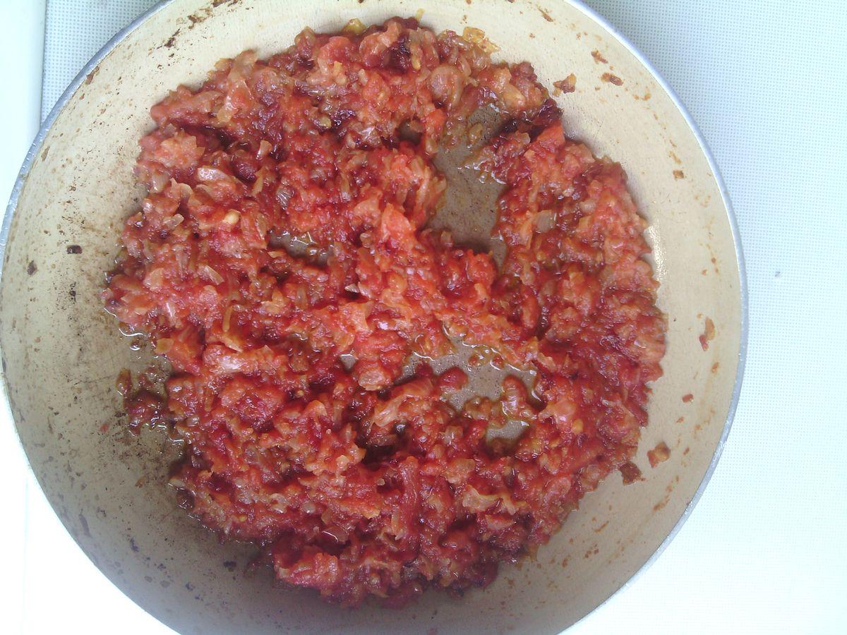 Add grated tomatoes or 1 tbsp to the fried onion. l tomato paste, or 200 ml lecho. Stew.