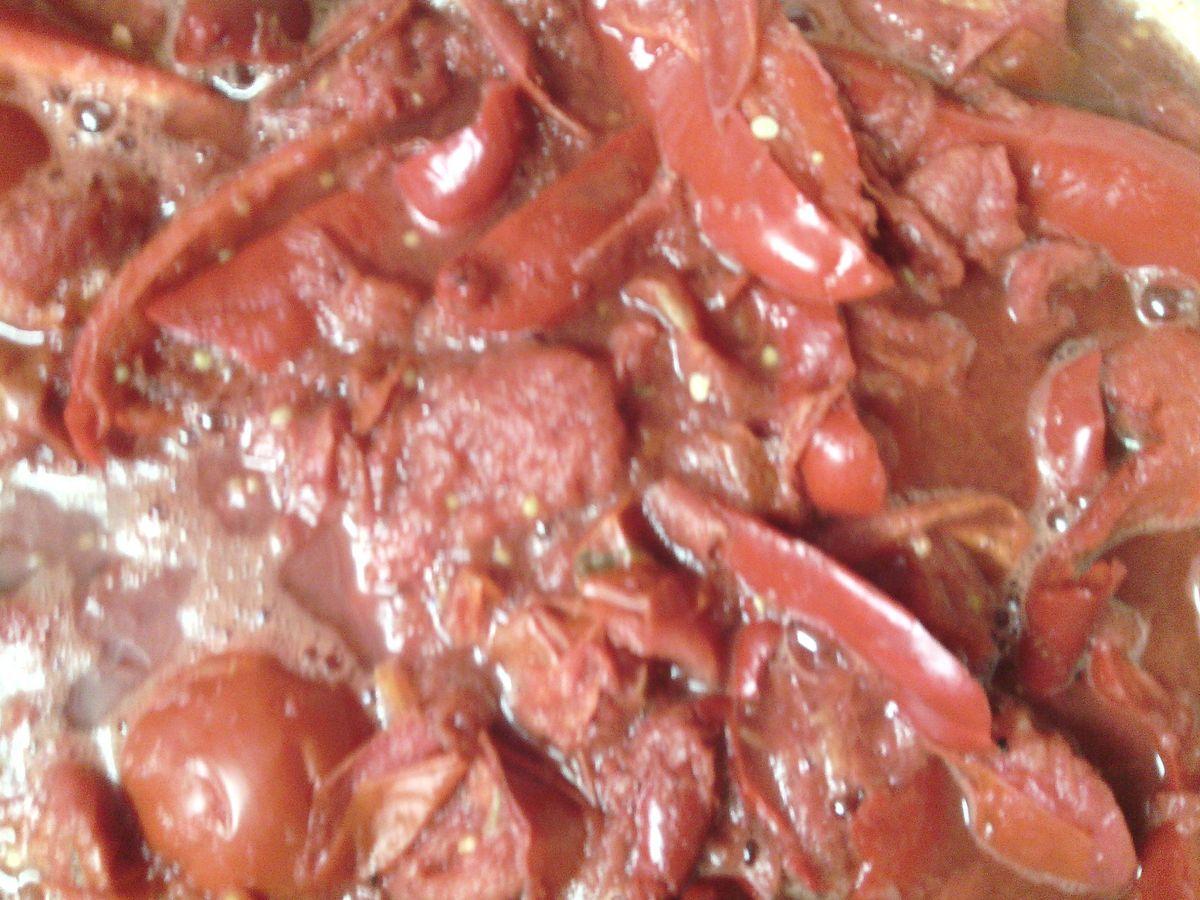 Pounded tomato-pepper mass is again poured into the pan, put on the fire, add salt and hot pepper to taste. Cook 30 minutes after boiling.