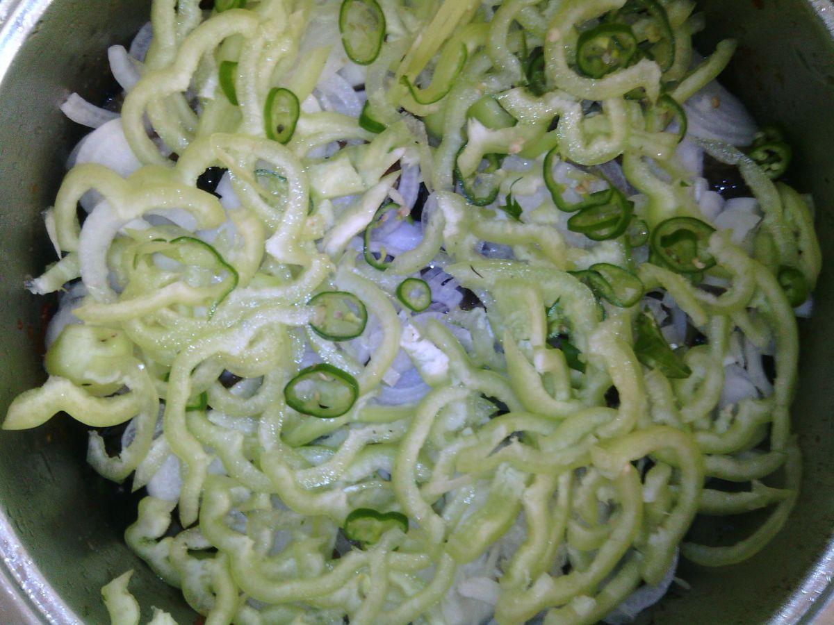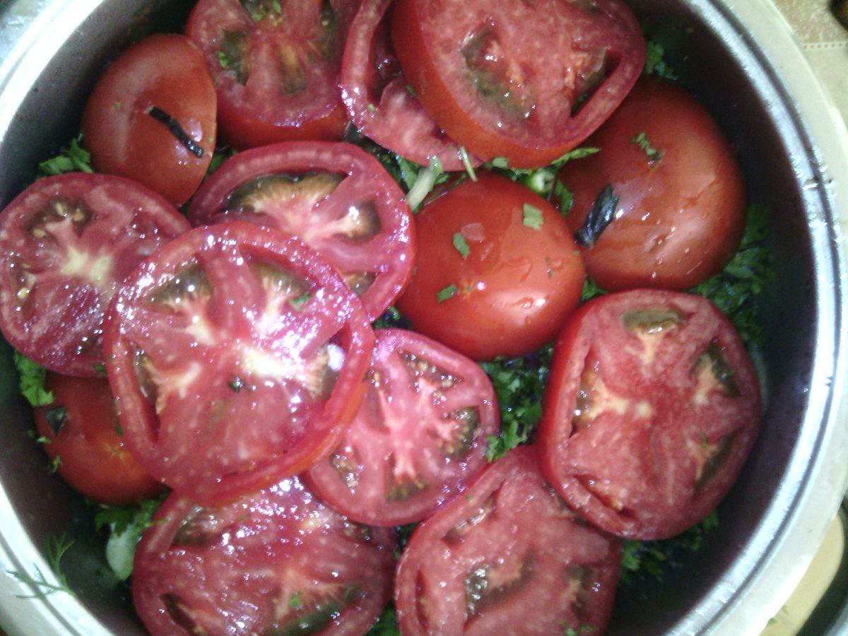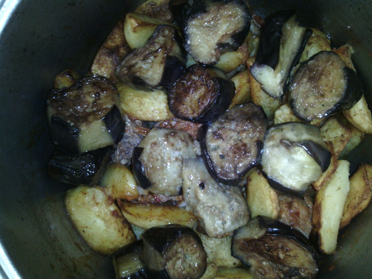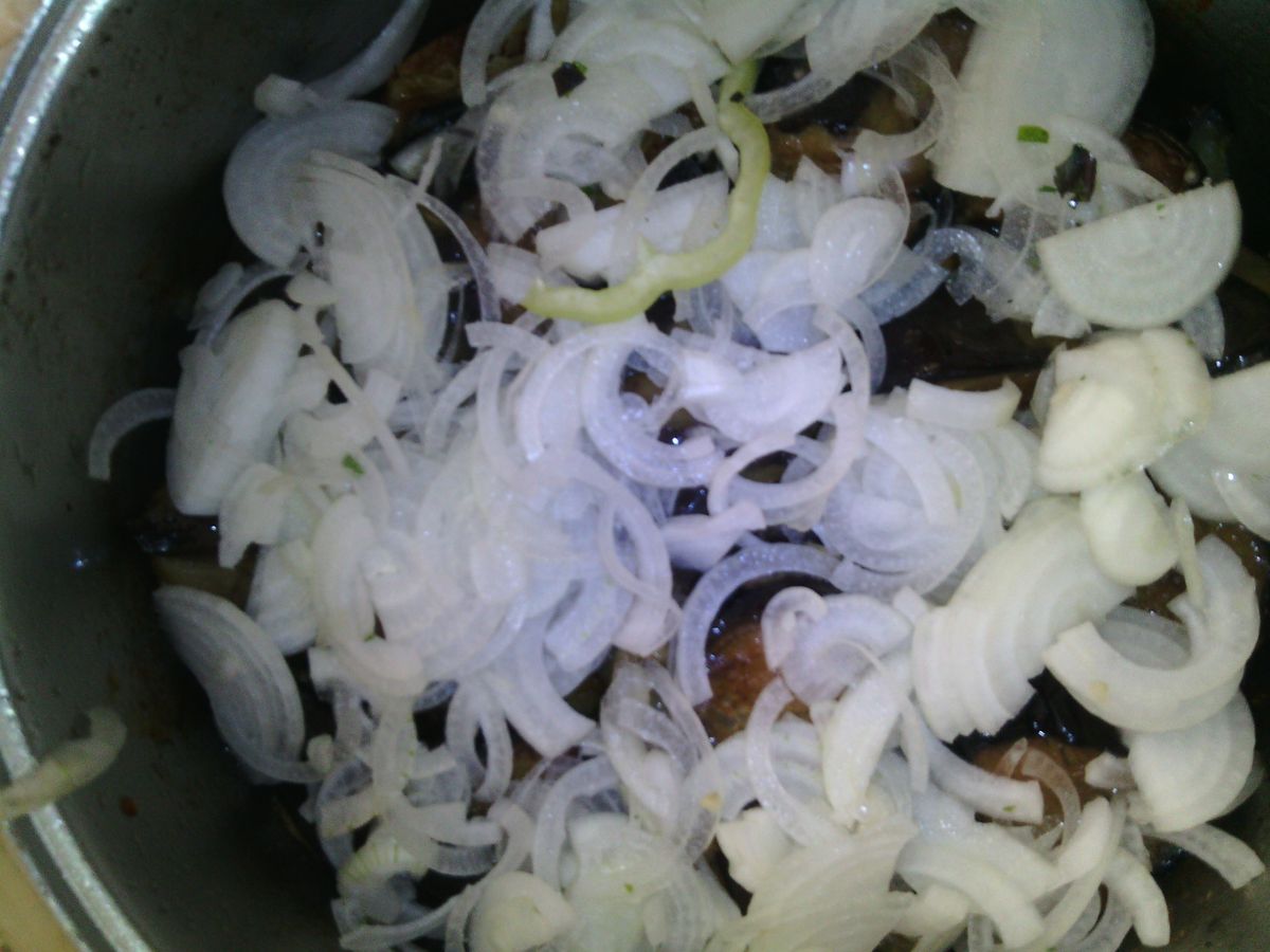 Put the potatoes on top. Then fried eggplant, then chopped onion, bell pepper and sliced tomatoes. Solim.