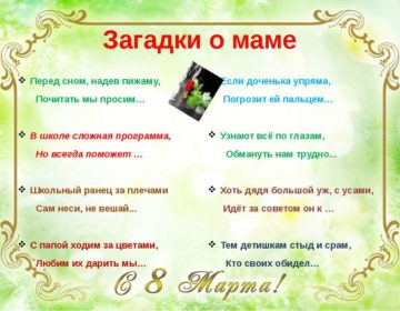 In this article you will find puzzles about mom for children with answers. They are also suitable for grandmother's birthday. These puzzles for mother's day will appeal to everyone. Each riddle speaks of love for mom.