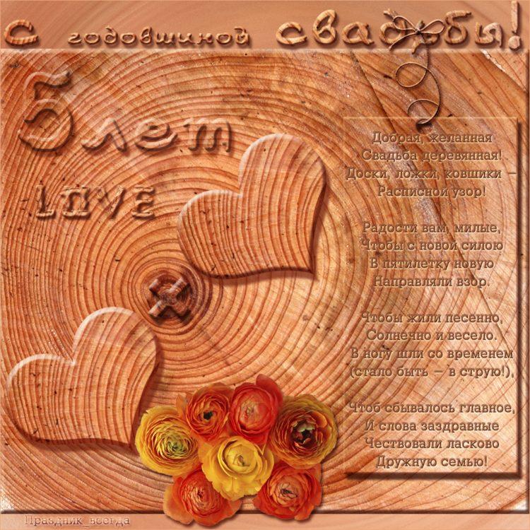A special place is occupied by funny congratulations on a wooden wedding, which allow fun and original congratulations to friends and relatives. We hope that having considered the cards with the fifth anniversary of the wedding that are different in execution and style, you will choose the option that suits you the most. It is up to you to decide what your congratulations to your dear people will be on this day. Choose your wishes in prose or poetry.