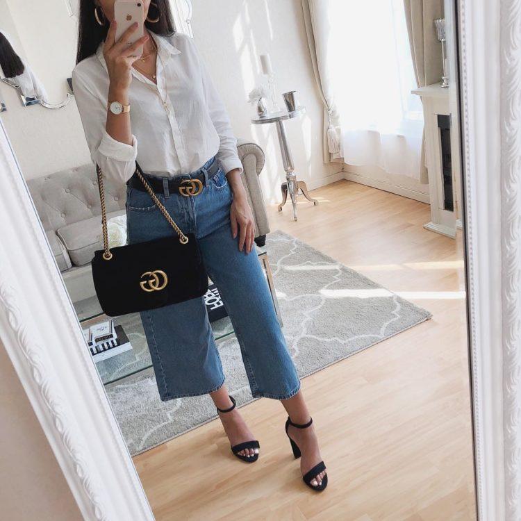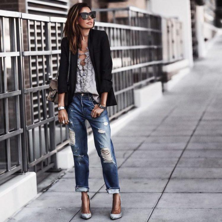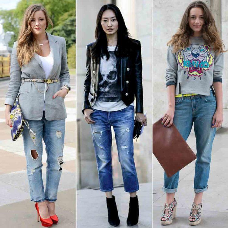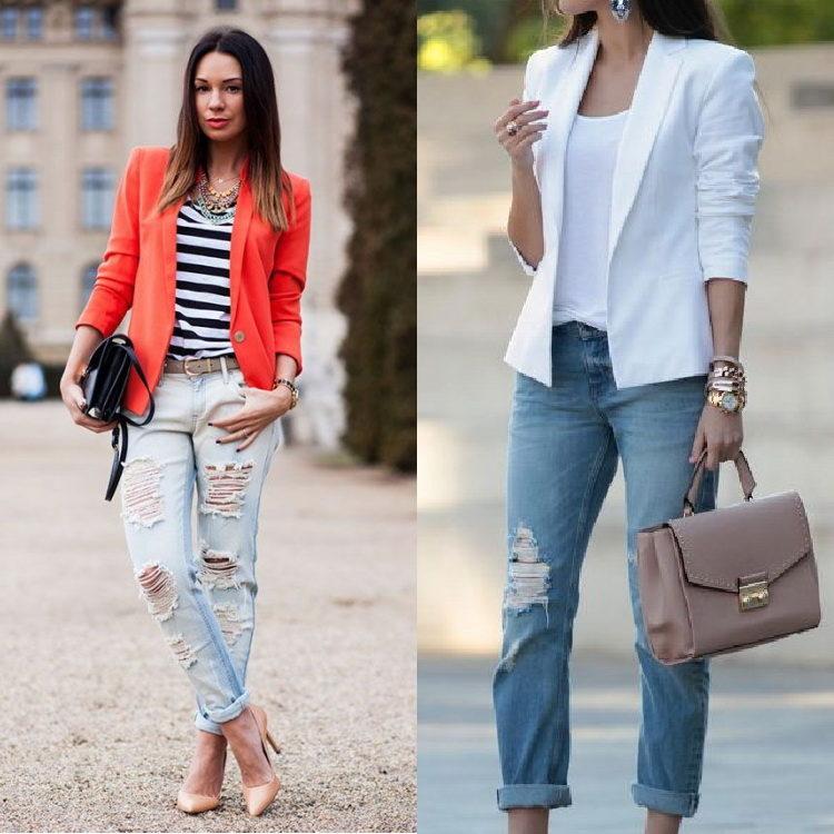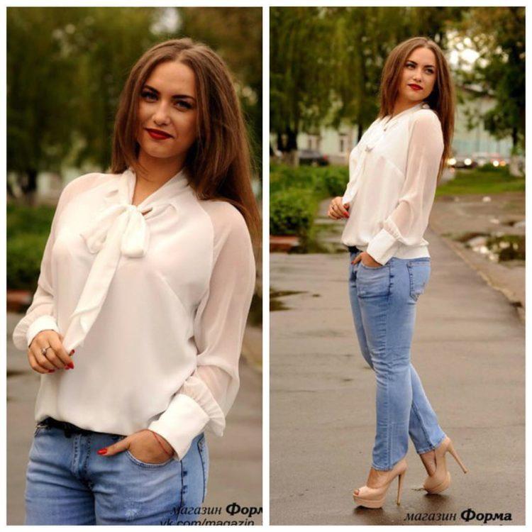 A bow with jeans for every day. Trendy jeans this summer - boyfriend jeans. The bow of a white shirt with jeans has become incredibly fashionable. In order not to cross out the image, a cropped jacket is chosen for beautiful jeans.