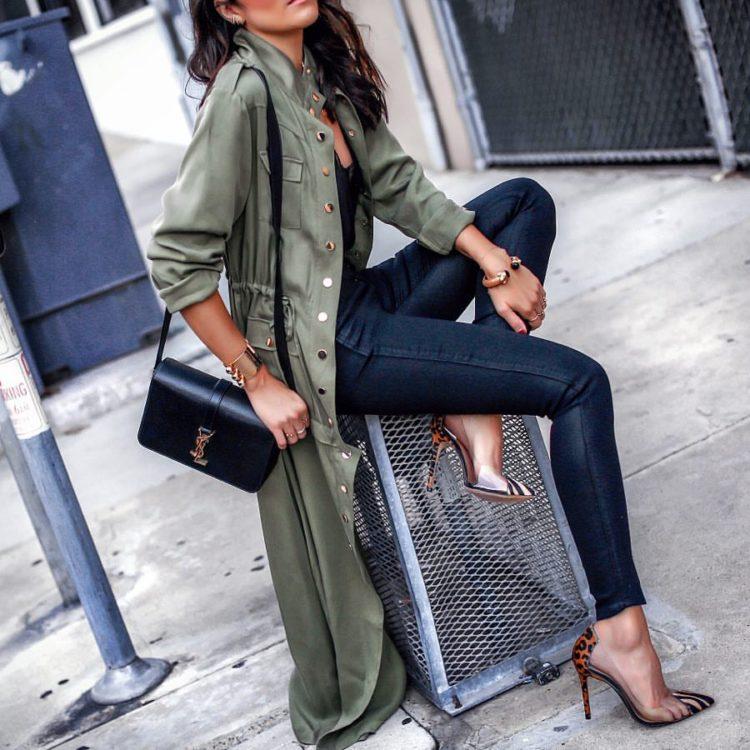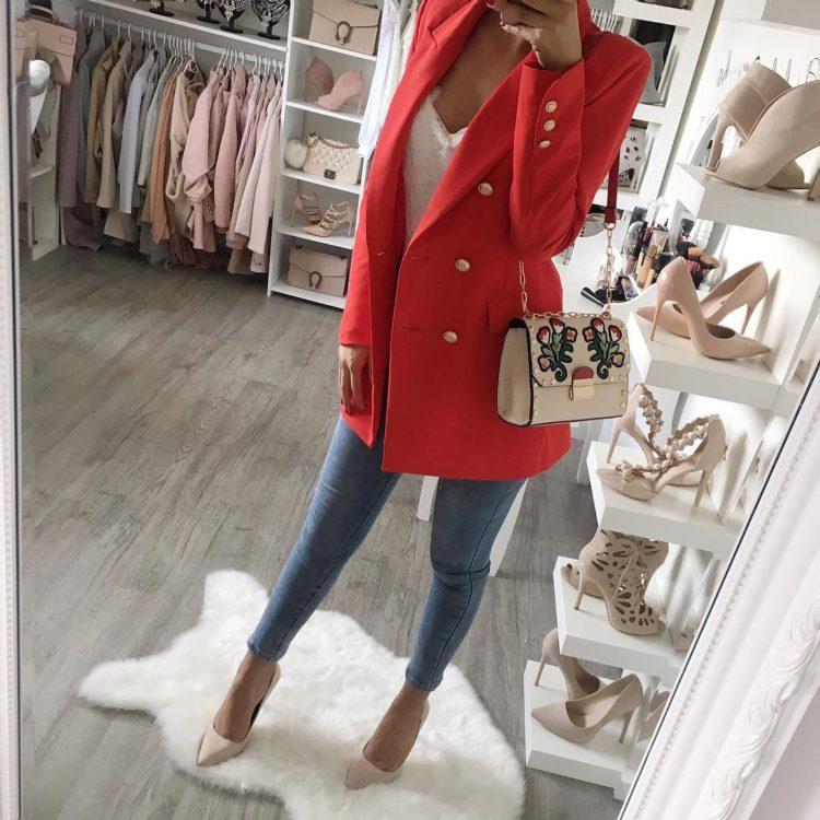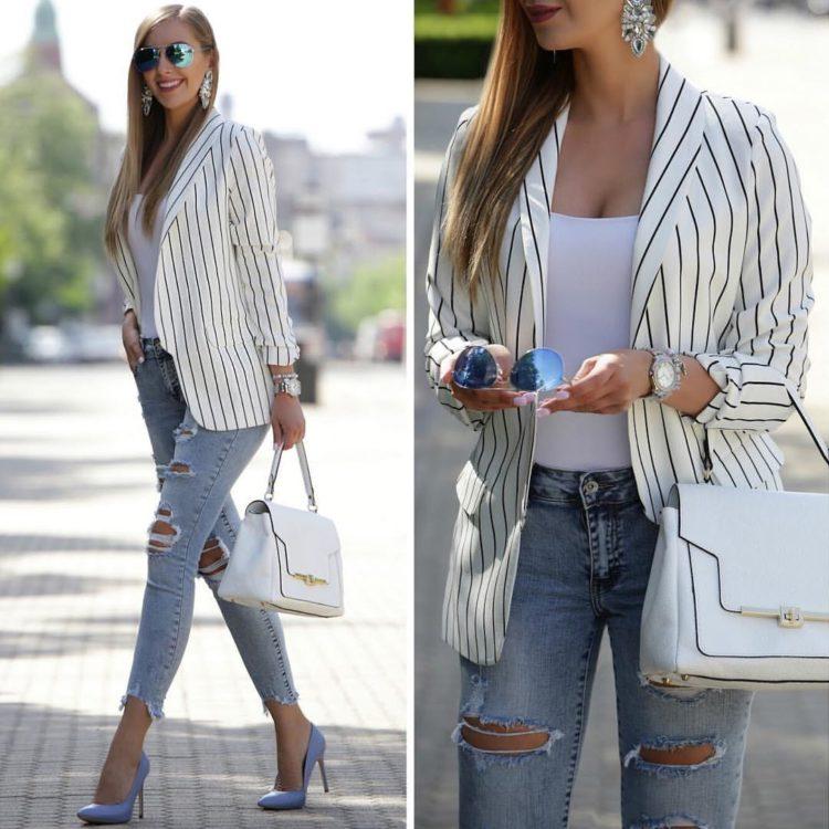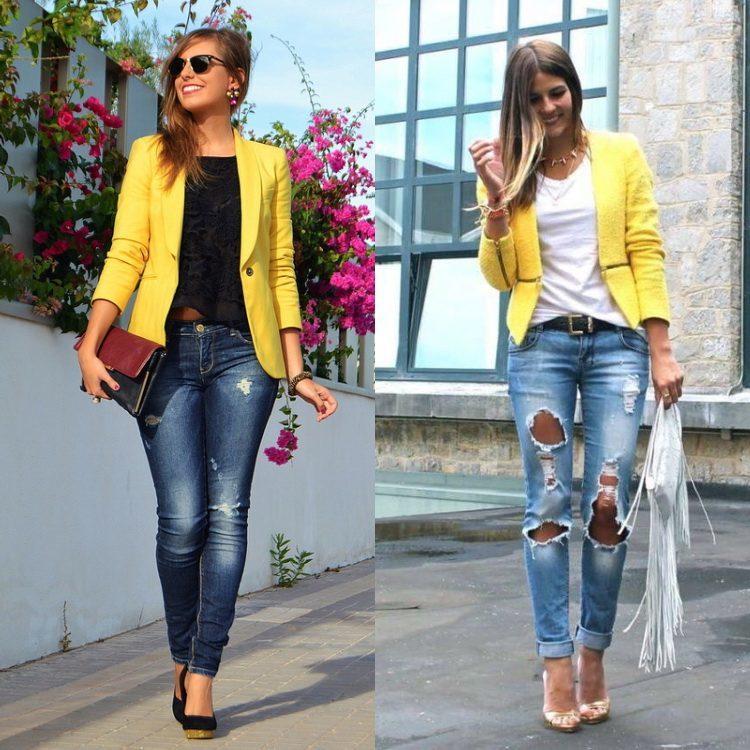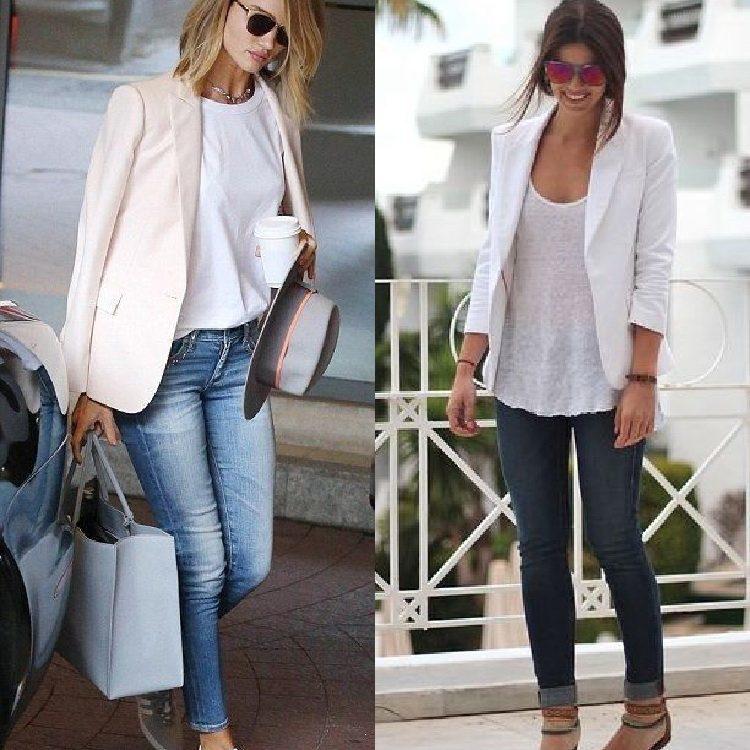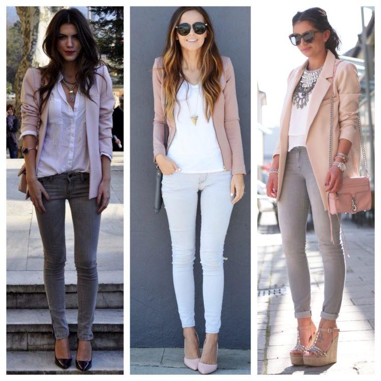 A wonderful combination - jeans and a jacket. Jeans with a jacket look good. Images with skinny jeans, especially black, are especially pleasing to the eye. A girl in a denim ensemble will suit a plain jacket or blouse. Here you can vary and play with color, fitting shoes, bag and accessories into the bow.