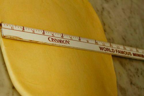 - Now that the dough is fully prepared for sculpting cinnabons, we take a rolling pin and roll out a thin layer about 5 millimeters thick and 12 x 16 inches (30 x 40 centimeters) in size.