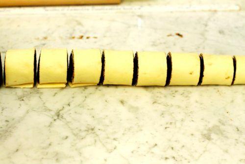 - We cut the resulting roll into pieces with a thickness of one inch (2.54 cm). You should get 12 parts. The knife must be used very sharp so as not to deform the buns, otherwise they may crumble. If this is not in the household, you can use a thin thread of white color. To do this, wrap the roll in the place where you want to make a cut and, as if tying a knot, pull both ends of the thread.