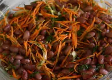 A complete salad recipe with beans and carrots with a step-by-step explanation and a photo. Lists of necessary utensils and products. Cooking Tips.