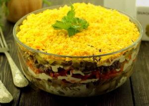 Puff salads for a birthday will be the perfect decoration on the table. And if guests unexpectedly come to you, you can easily cook simple puffed salads in a hurry according to our recipes with photos. Choose recipes for every taste! Having prepared the salad in layers for a holiday or for an ordinary meeting with friends, you will definitely surprise them with your culinary talents! Choose the most popular options, for example, an intergirl salad or a salad recipe with layers of “fill”, or experiment and create individual recipes for puffed salads.