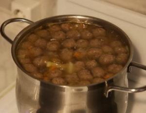 Meatball soup can be prepared on water or in broth - meat, fish, vegetable. In addition to meatballs, you can add to the broth as you wish: potatoes, onions, carrots, bell peppers, broccoli, asparagus, tomatoes, cauliflower inflorescences, celery, pumpkin, noodles or vermicelli, buckwheat, rice, semolina, oatmeal, pearl barley, green peas or beans, cream cheese or cream.