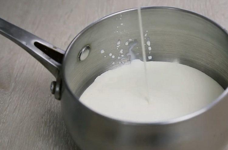 - In a saucepan, pour 100 grams of cream and send to the fire. It is necessary to slightly warm them, but do not boil.