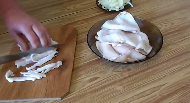 - At this time, the squid is cut into strips with a knife. It is better to stack them in a stack of 2-3 carcasses immediately.