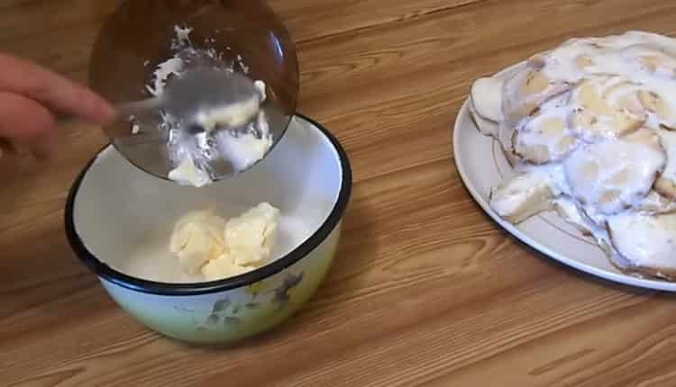 - In another deep bowl, put 500 g of sour cream, 1 cup of sugar and beat these products until smooth.
