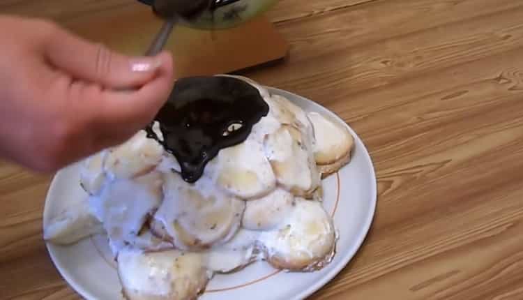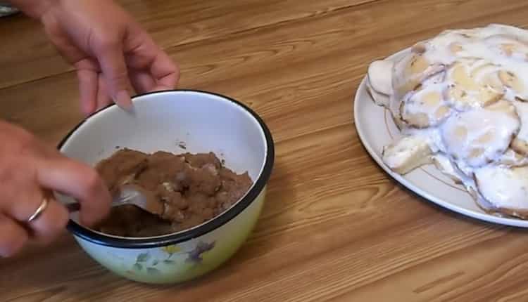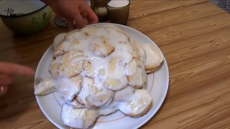 - Now you need to form a cake. To do this, you need a large dish or tray. Each cake must be dipped in a sour cream and sugar mixture and lay out the cake in the form of a turtle. Put the rest of sour cream on top for better impregnation. After this, you can begin to prepare the glaze.