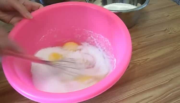 - Break 6 chicken eggs into a deep bowl, add 1.5 cups of granulated sugar to them and beat with a whisk until a white mass is obtained.