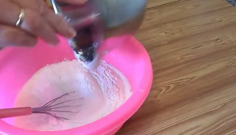 - Pour 2 cups of flour into a separate bowl, add soda to it (1 tsp. Without a slide), mix well, pour into a sugar-egg mass and knead the dough. By consistency, it should resemble thick sour cream.