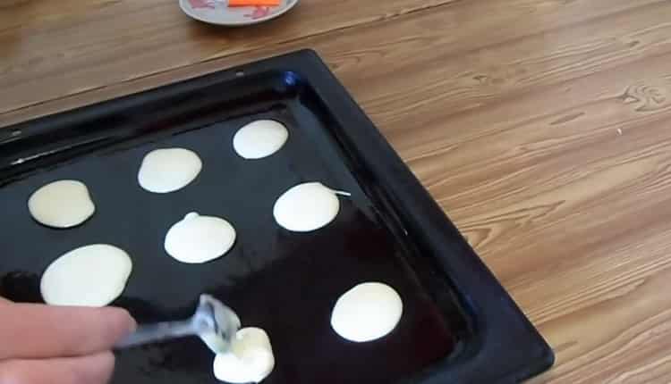 - Using a silicone brush, grease a baking sheet with vegetable oil (1 tsp), form small cakes on it (one cake takes about half a tablespoon of dough) and send to bake in the oven, heated to 180-190 ° C until golden brown. Between each cake you need to leave free space, because during baking they fit and increase in size. After the base is prepared, you can start cooking sour cream.