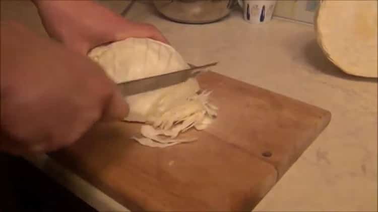 - Boil three chicken eggs for 7 minutes. Then fill with cold water, let cool. For the filling, we will use ¾ parts of the head of cabbage. The amount of cabbage will depend on the volume of filling you need. Cut the cabbage into thin strips. We send it to the pan, add salt, alter and mash with your hands so that the cabbage is soft, let the juice flow. You will notice how this happens, because there will be less shredded cabbage. This process may take 5-7 minutes.