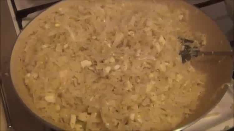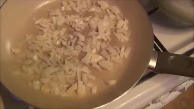 - We clean two onions, wash, cut into small cubes. We send the pan to the fire, pour vegetable oil. Let the oil heat up and send the chopped onion to the pan.