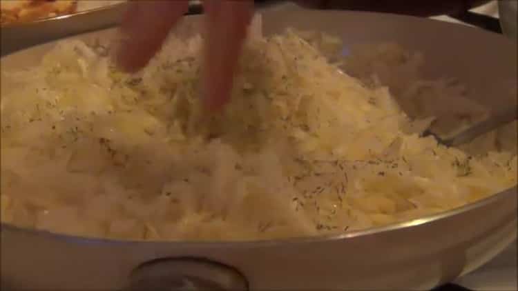 - While the onion is fried, squeeze the cabbage to get rid of the juice, and send it to the pan. Fry vegetables, stirring occasionally. Sprinkle cabbage with chopped dill. You can use dried or fresh.