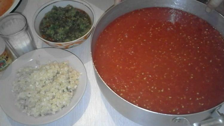 - Twist in separate containers 5 kg of tomatoes, 500 g of bell pepper, 400 g of garlic and 2 pods of hot pepper.