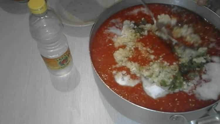 - In a container with tomatoes, add pepper, garlic, 3 tbsp. l salt and 5 tbsp. l vinegar. Mix everything.