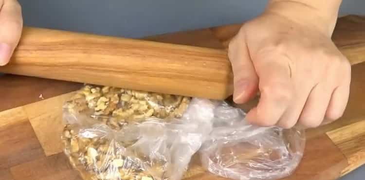 - Wrap 40 g of walnuts in plastic wrap or a small plastic bag, spread them evenly inside and chop by rolling with a rolling pin. You can also grind them in any other way available to you.