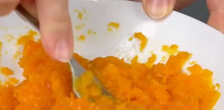 - Mash 250 g of pulp previously baked in the oven of the pumpkin thoroughly with a fork or beat with a blender until the consistency of mashed potatoes.