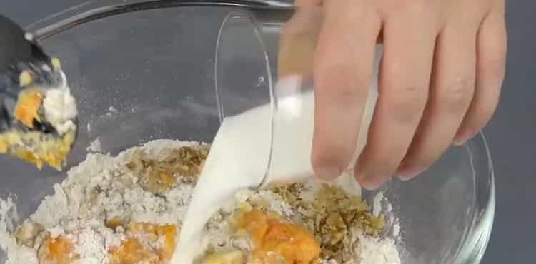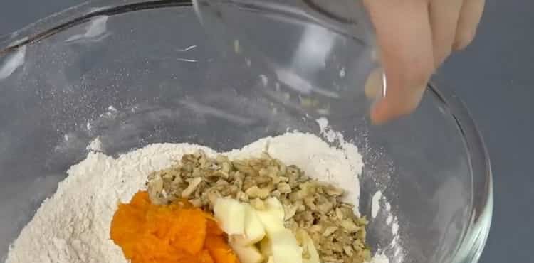 - In a deep bowl, mix 350 g of flour, 40 g of sugar, 1.5 tsp. baking powder and 0.5 tsp. cinnamon. Mix everything thoroughly. Add 40 g of melted butter, mashed pumpkin pulp and chopped walnuts to the resulting mixture.