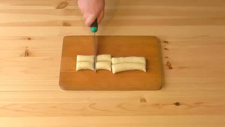 - We spread it on the table, roll it out with one layer one centimeter thick. Now this dough needs to be divided into eight equal parts. Cut into four parts lengthwise, then cut once across. We got 8 equal oblong parts, from which we will form cookies.