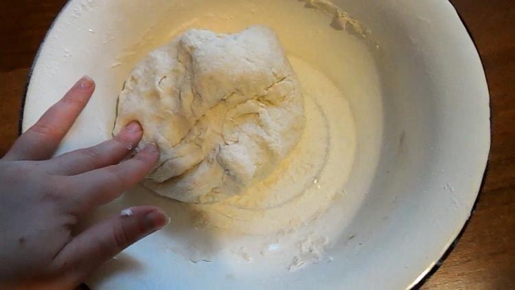 - After 15 minutes, the sponge will increase 3-4 times. Add ½ tsp to a bowl. salt, pour a little vanillin, a little less than half a teaspoon. Pour 60 g of vegetable oil into a pair. Then gradually sift into a bowl about 350-400 g of flour and knead the dough with a tablespoon. When the dough has thickened, knead it with your hands. Then shift it to the work surface and knead for about 10 minutes until a smooth, uniform lump. Flour may need more depending on its quality.