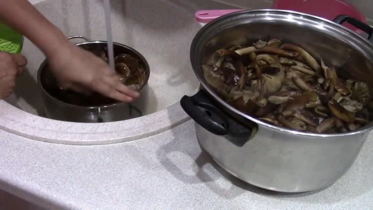- We mushrooms mushrooms collected in the forest in an amount of about 5-6 kg, we sort out, remove excess debris, and clean from undesirable fractions. We wash the mushrooms under running water, place in a large pot or basin, pour clean water so that honey agarics are covered with water. We put on the fire. Bring to a boil and cook for five minutes.