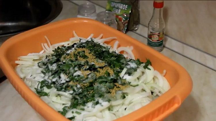 - We cut the onions in half rings and also put in a bowl.