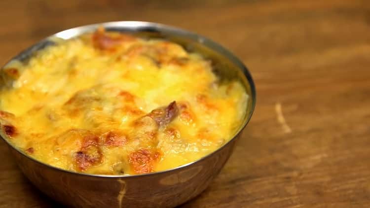 - We send all the ingredients to the bowls and sprinkle with cheese on top. We put everything in the oven and bake at a temperature of 180 degrees for about 15-20 minutes.