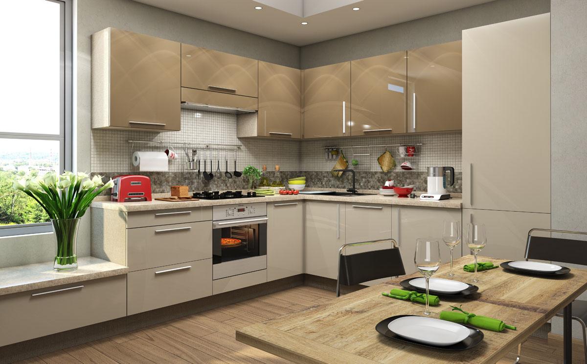 - L layout - One of the most popular options, but it is not suitable for long and narrow kitchens. All elements are located along two walls at an angle, which allows you to effectively organize the workplace and at the same time leave enough space for the dining area.